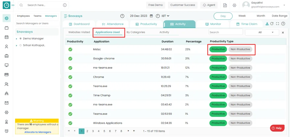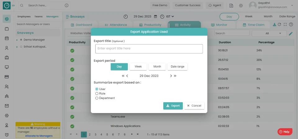 The activity module keeps track of every record of an employee's activity during working hours on applications / websites visited by the employee, as well as the duration spent on each application and the percentage of total time spent on each application. Based on your classification, you can download the data.